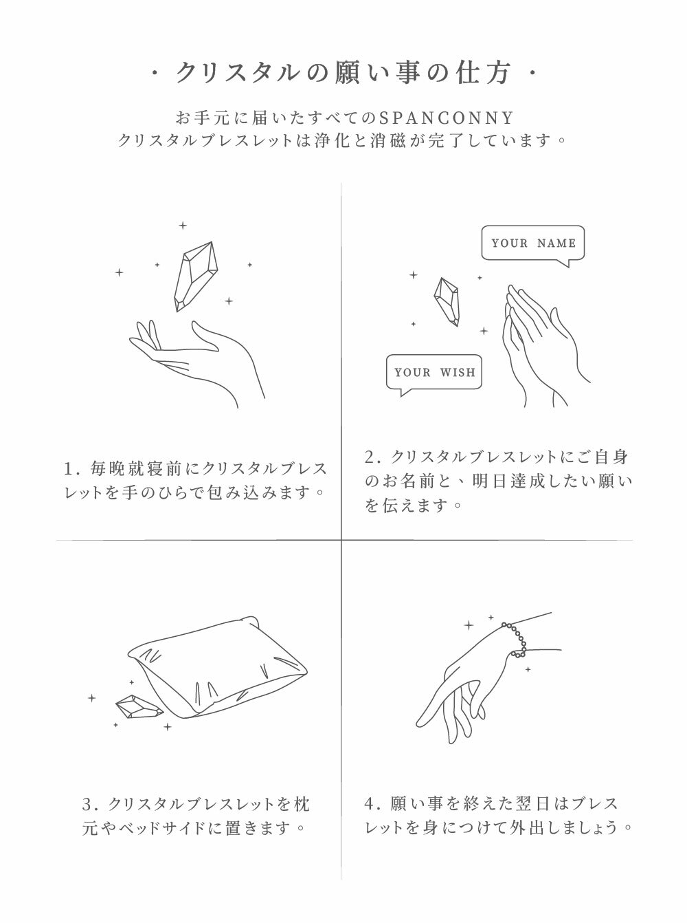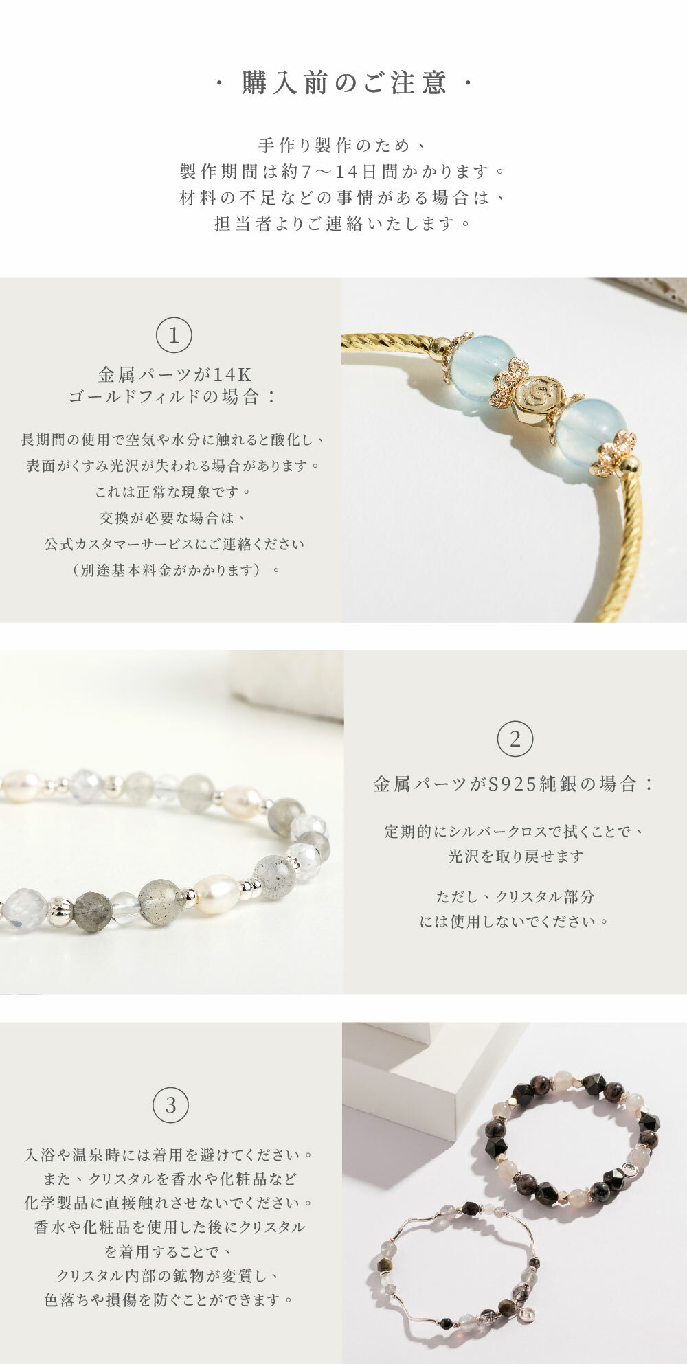 ◦ このクリスタルブレスレットは弾力性のある糸で作られており、日常的に使用しているとビーズが動き、糸の端が出てくることがありますが、これは正常な状態です。糸の端はビーズに隠すことができますのでご安心ください。