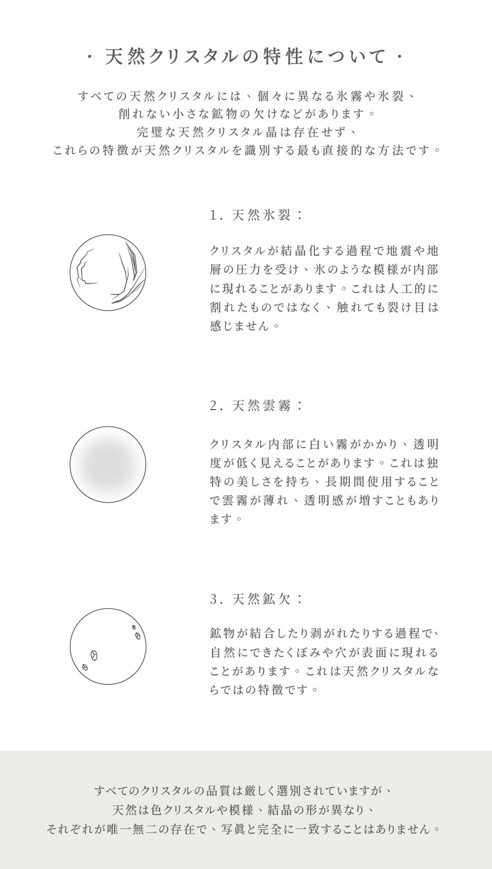 ◦ 天然クリスタルを使用しているため、クリスタル内部に氷裂、綿毛、鉱物欠損などの状態がありますが、これは天然クリスタル特有の特徴であり、欠陥ではありません。
