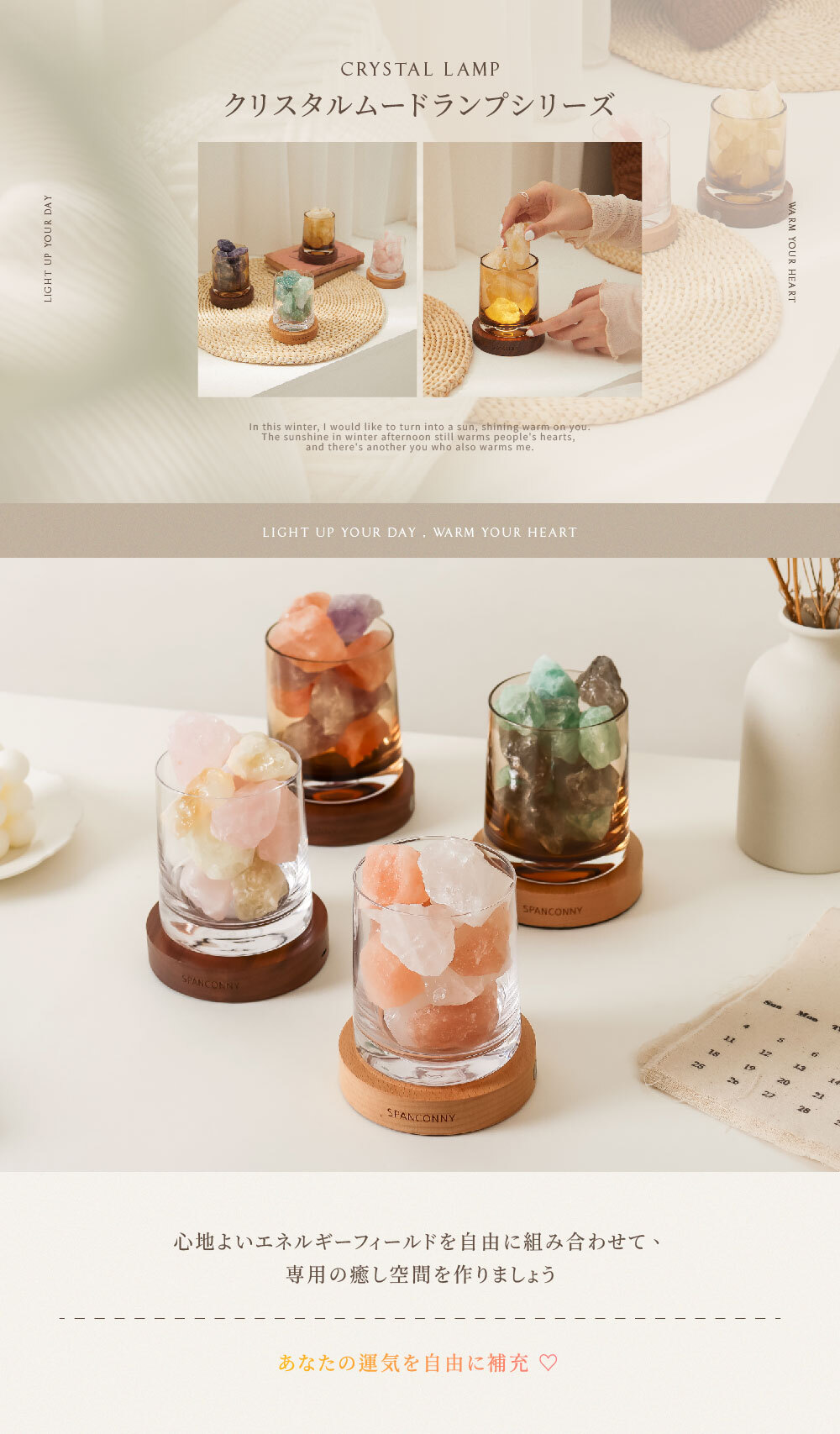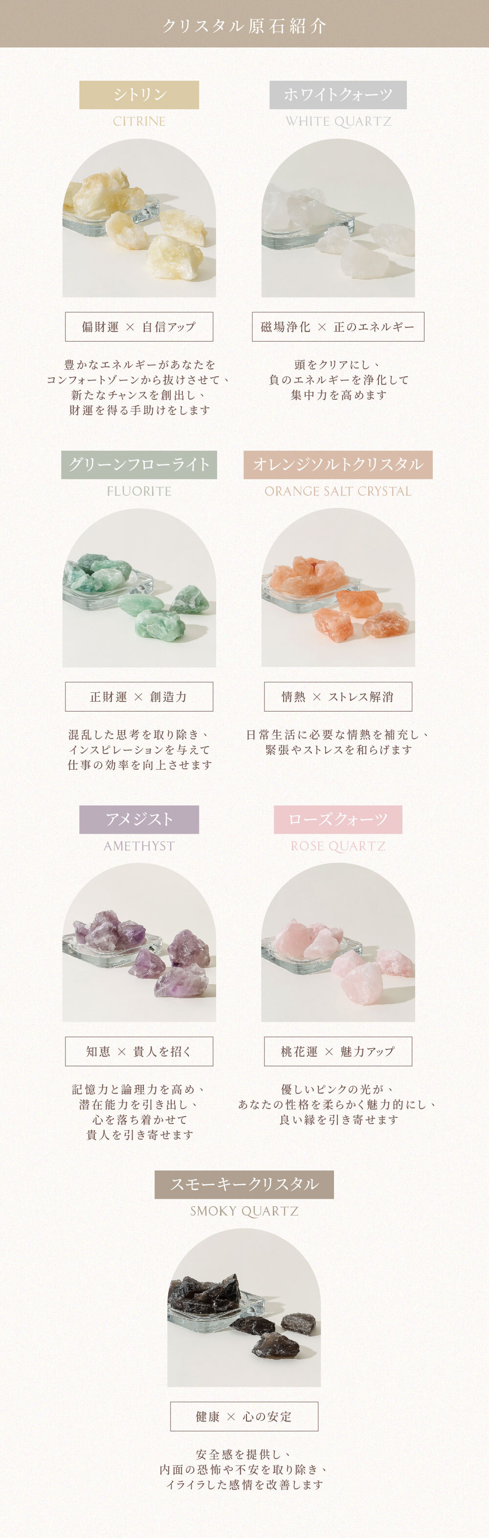 クリスタル l ホワイトクォーツ、ローズクォーツ 、シトリン 、グリーンフローライト 、スモーキークォーツ 、アメジスト 、オレンジヒマラヤンソルト