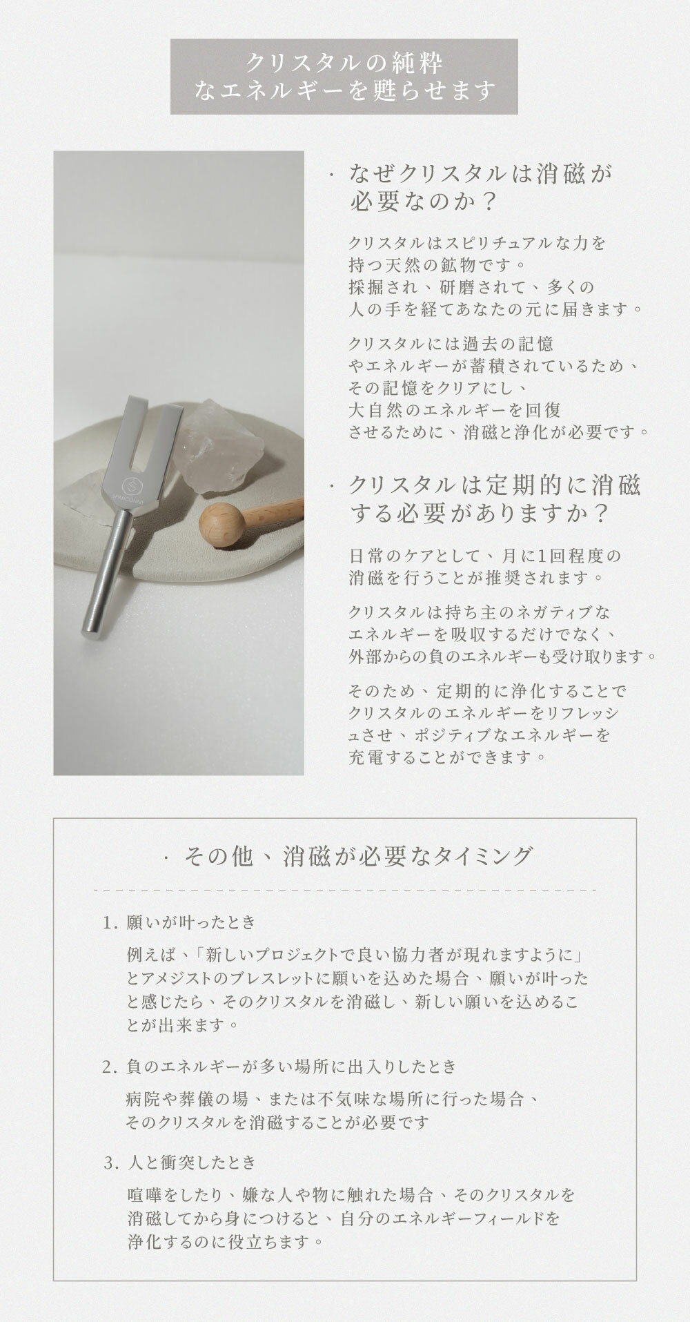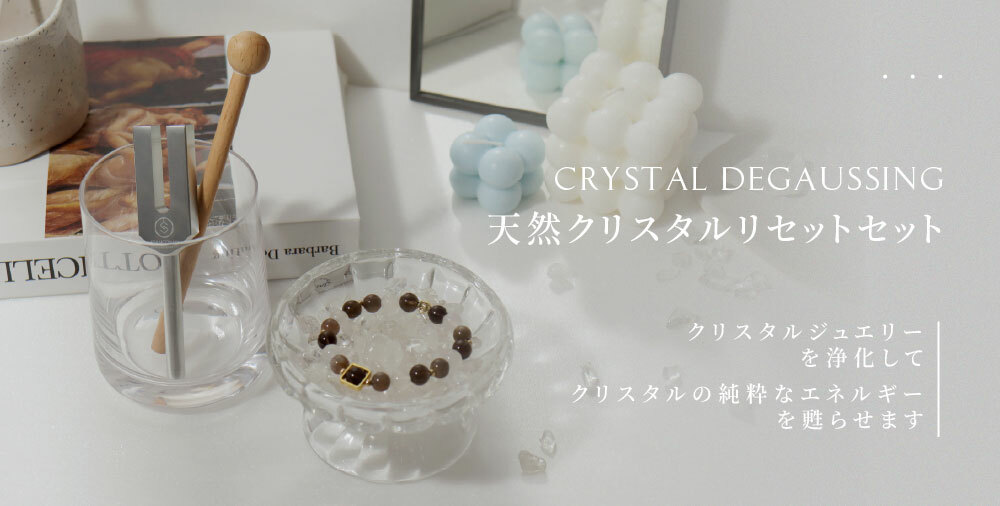 木槌で音叉を叩き、振動している音叉の柄をクリスタルから約15cm離れた位置で3回円を描くように回すことで、エネルギー振動を増幅・発射し、クリスタルを浄化することができます。