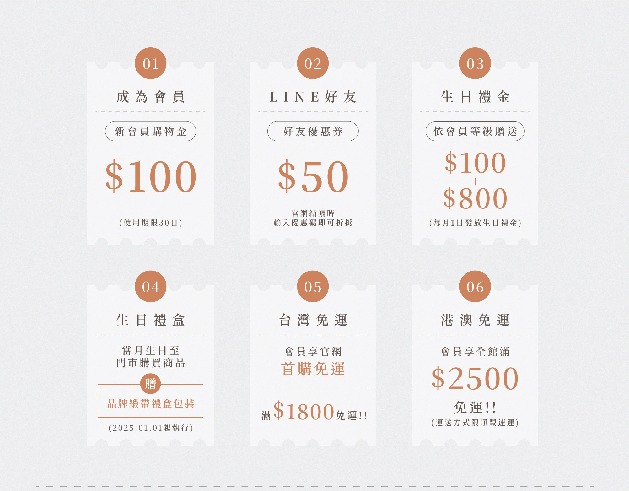 3. 官網結帳的訂單若符合會員升等的條件,需要等待訂單狀態更新為"已完成"後,系統才會完成升等並享有下筆訂單會員折扣;若是於門市消費達成會員升等的條件,系統過00:00後將會自動判斷升等,升等後的下筆訂單才可使用會員折扣。