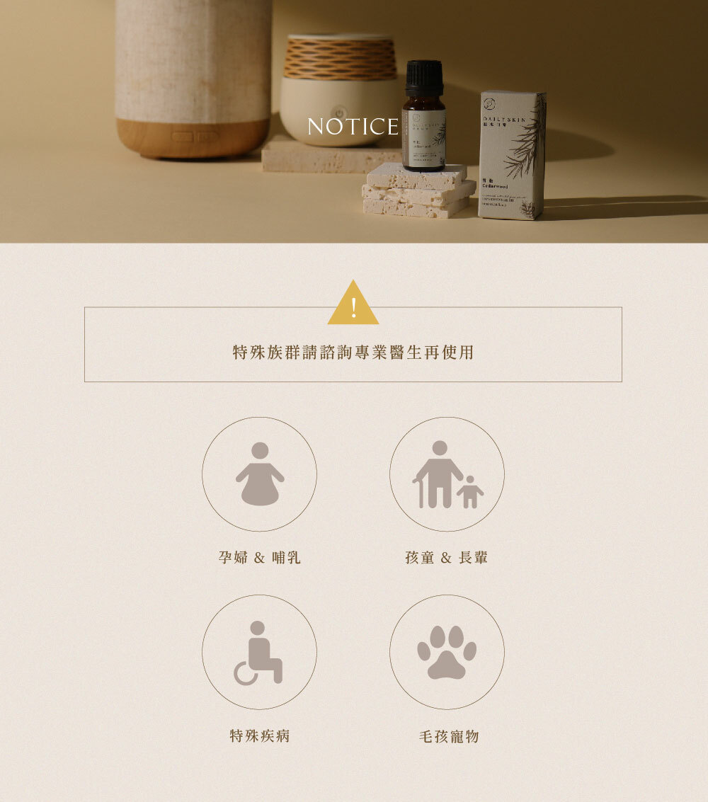 ◦ 純精油是高濃縮的成分,請勿直接使用在皮膚上,建議使用植物油調和稀釋,若未經稀釋僅可作為薰香用途。