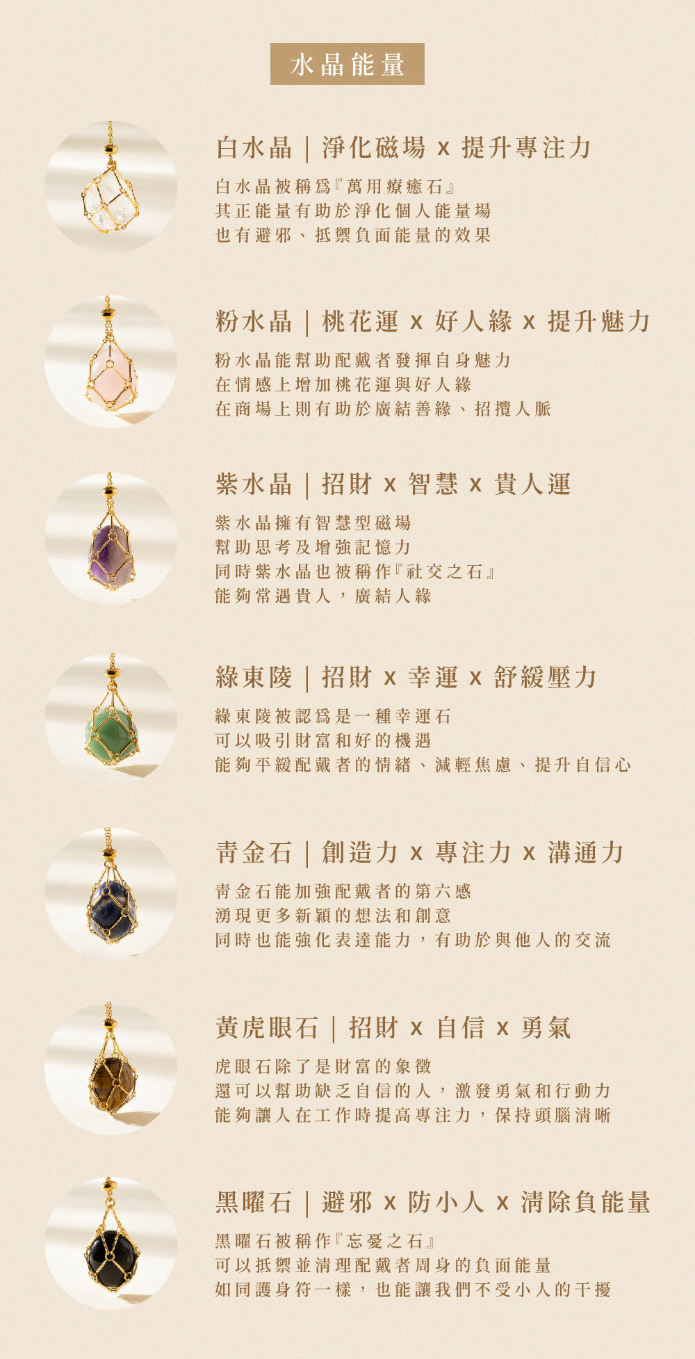 ◦ 白水晶、粉水晶、紫水晶、綠東陵、青金石、黄虎眼石、黑曜石、黃水晶 (8款水晶任選)