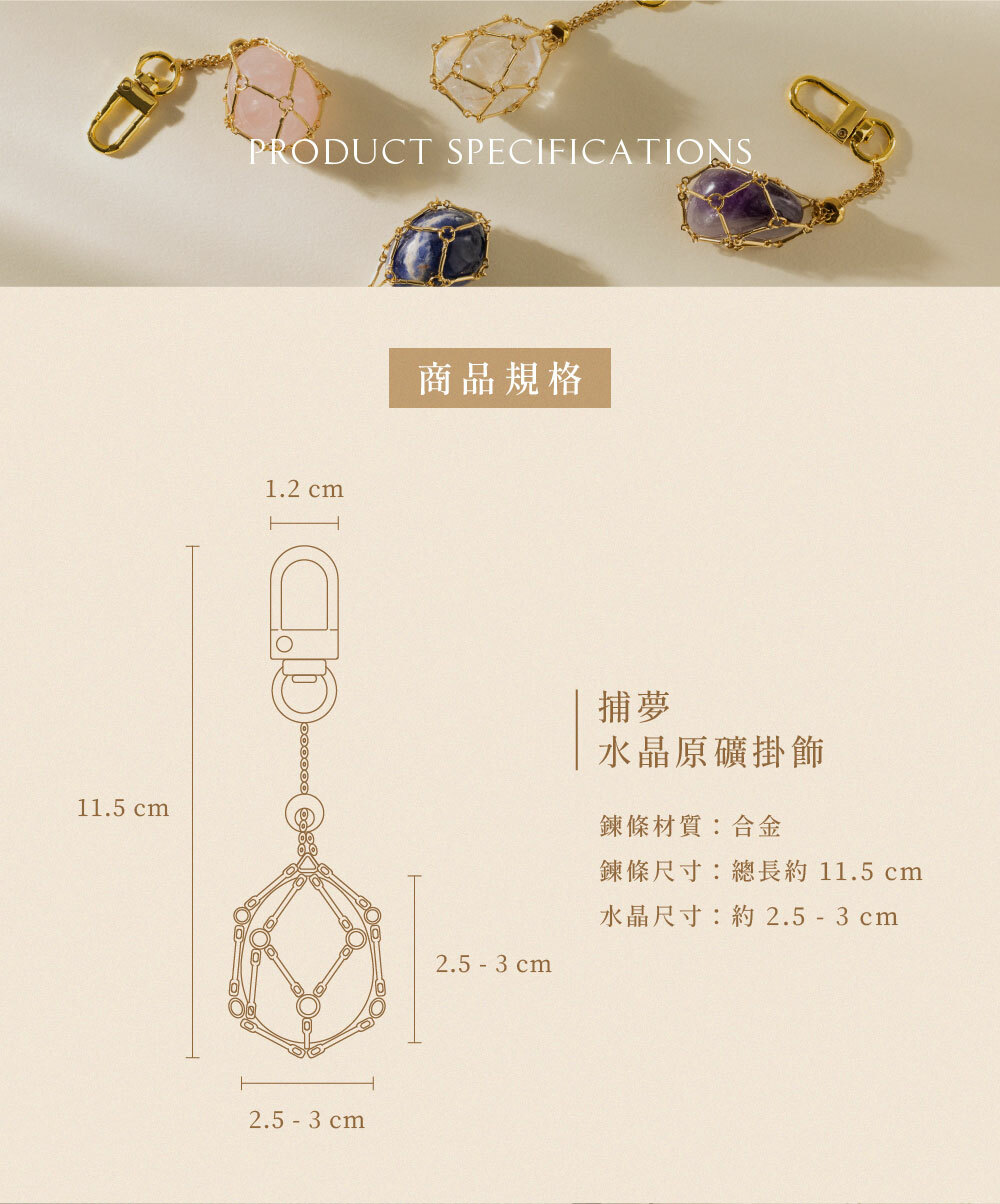 ◦ 採用天然水晶,水晶顏色會有深淺差異,且晶體內部有冰裂、棉絮、礦缺等狀態,皆為天然水晶的獨有特色,並非瑕疵。