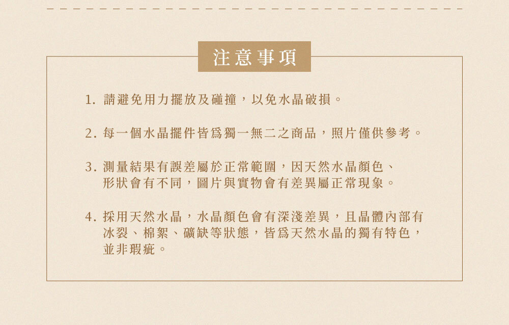 ◦ 請避免用力擺放及碰撞,以免水晶破損。