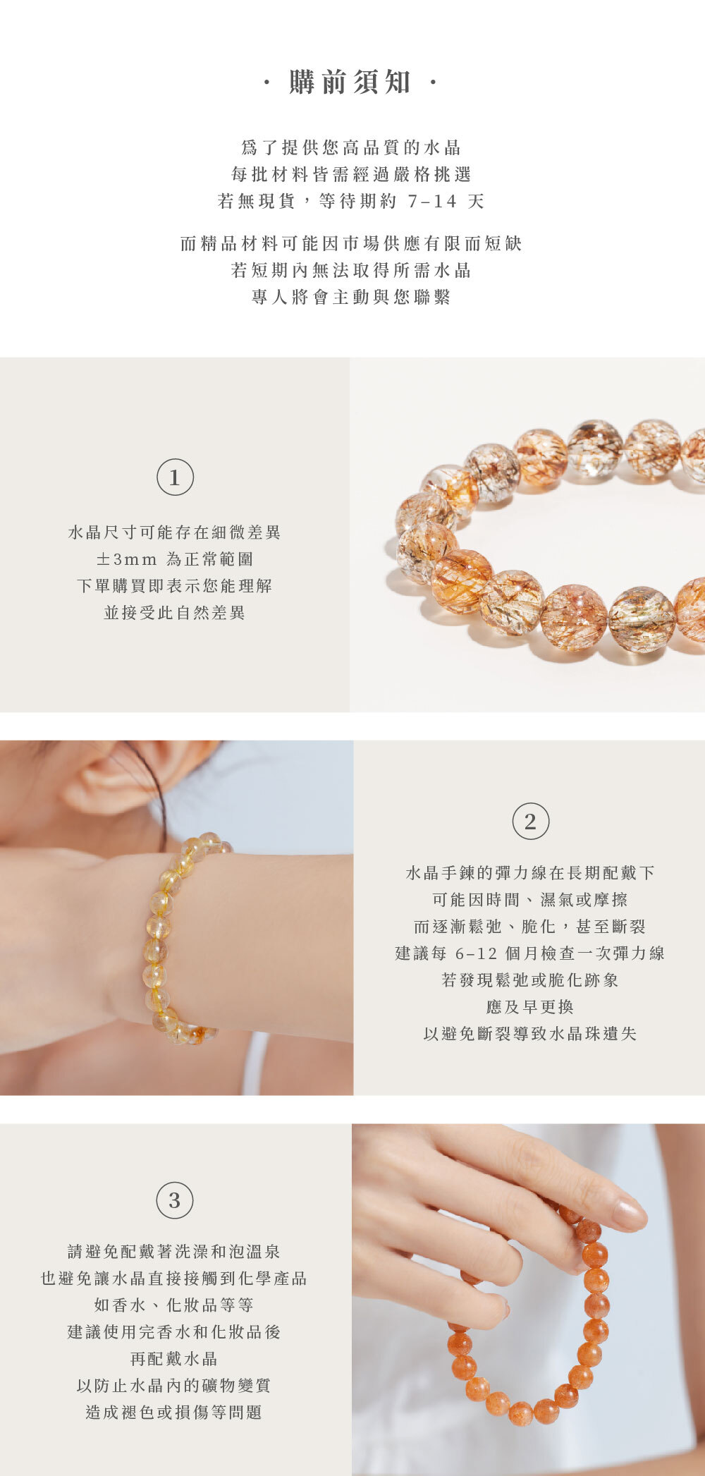 ◦ 此款水晶手鍊以彈力線製作,平常配戴時珠子會滾動,線頭跑出來是正常狀況,只要把線頭拉進珠子裡藏起來即可。