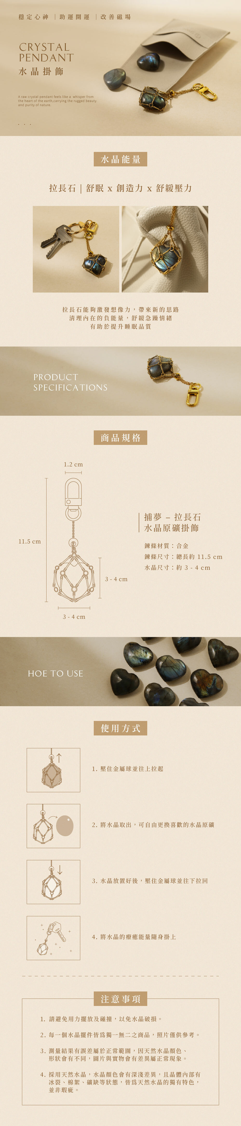 ◦ 採用天然水晶,水晶顏色會有深淺差異,且晶體內部有冰裂、棉絮、礦缺等狀態,皆為天然水晶的獨有特色,並非瑕疵。