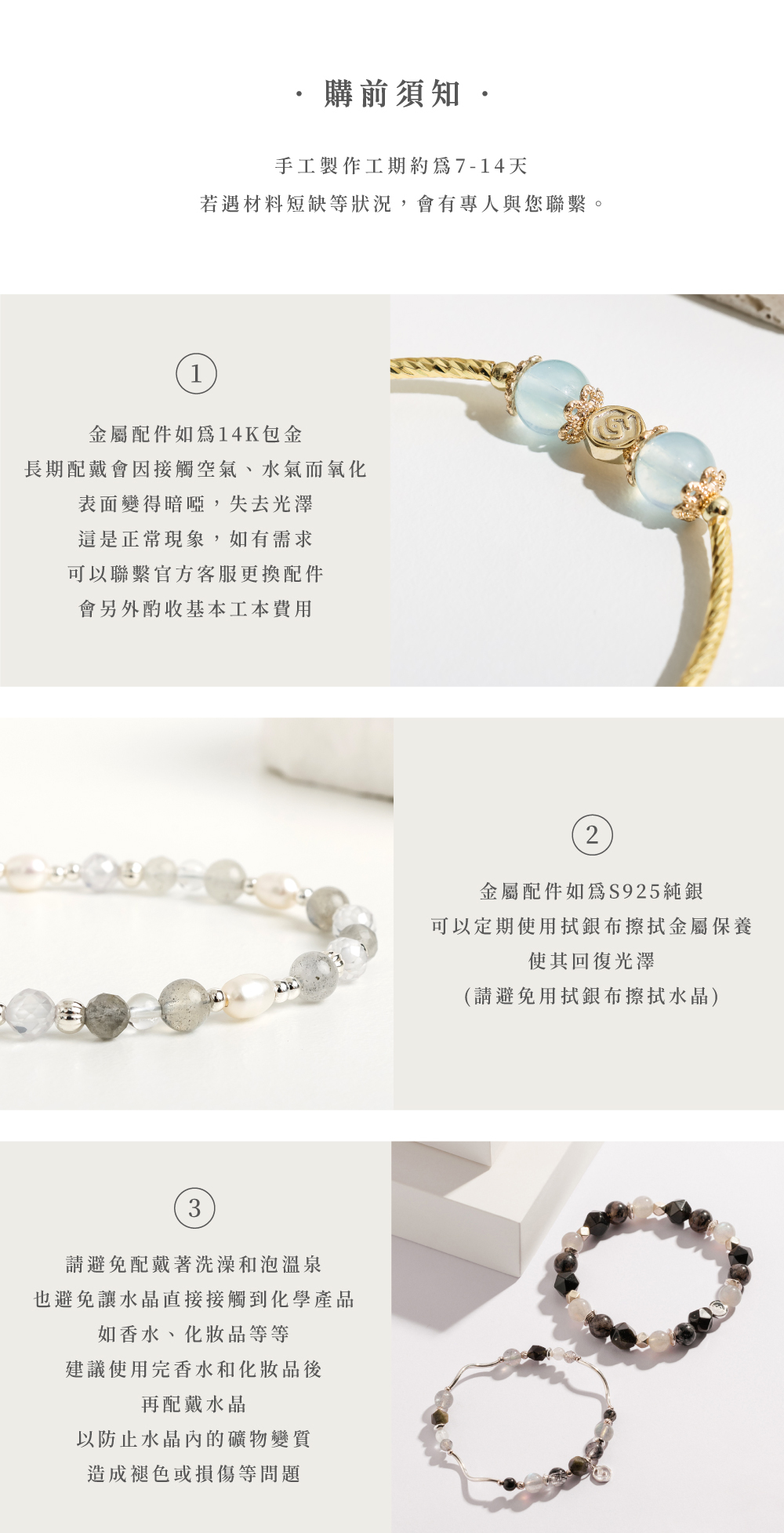 ◦ 水晶手鍊以彈力線製作,平常配戴時珠子會滾動,線頭跑出來是正常狀況,只要把線頭拉進珠子裡藏起來即可。