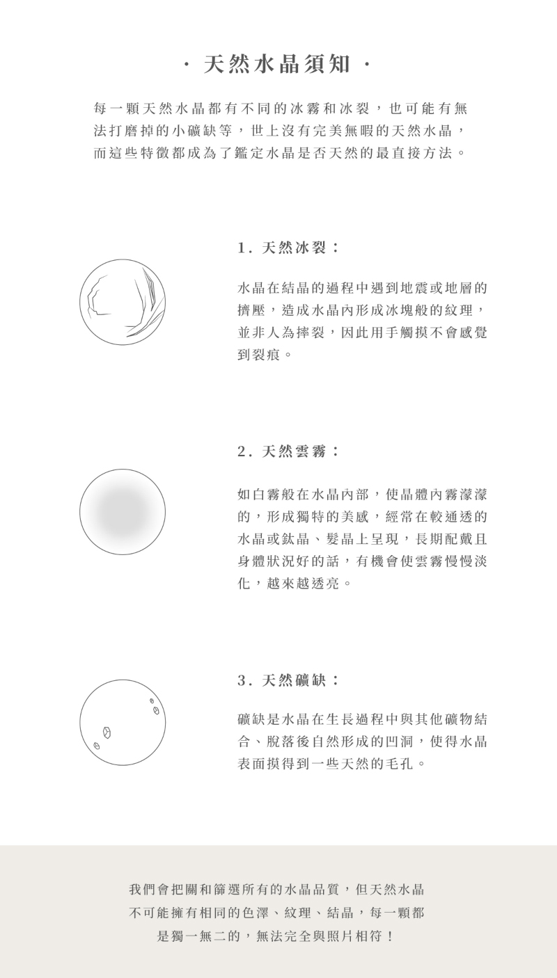 ◦ 採用天然水晶,晶體內部有冰裂、棉絮、礦缺等狀態,皆為天然水晶的獨有特色,並非瑕疵。