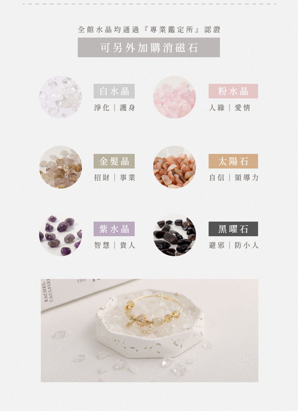◦ 採用天然水晶,晶體內部有冰裂、棉絮、礦缺等狀態,皆為天然水晶的獨有特色,並非瑕疵。